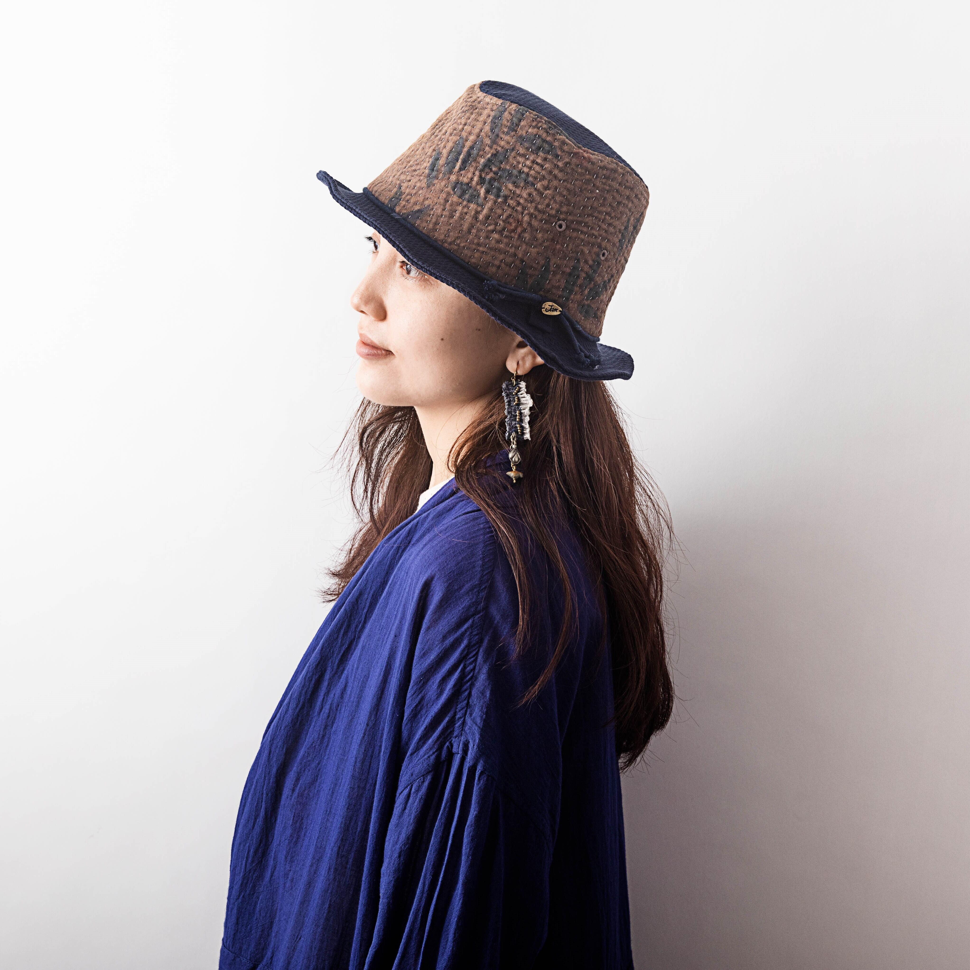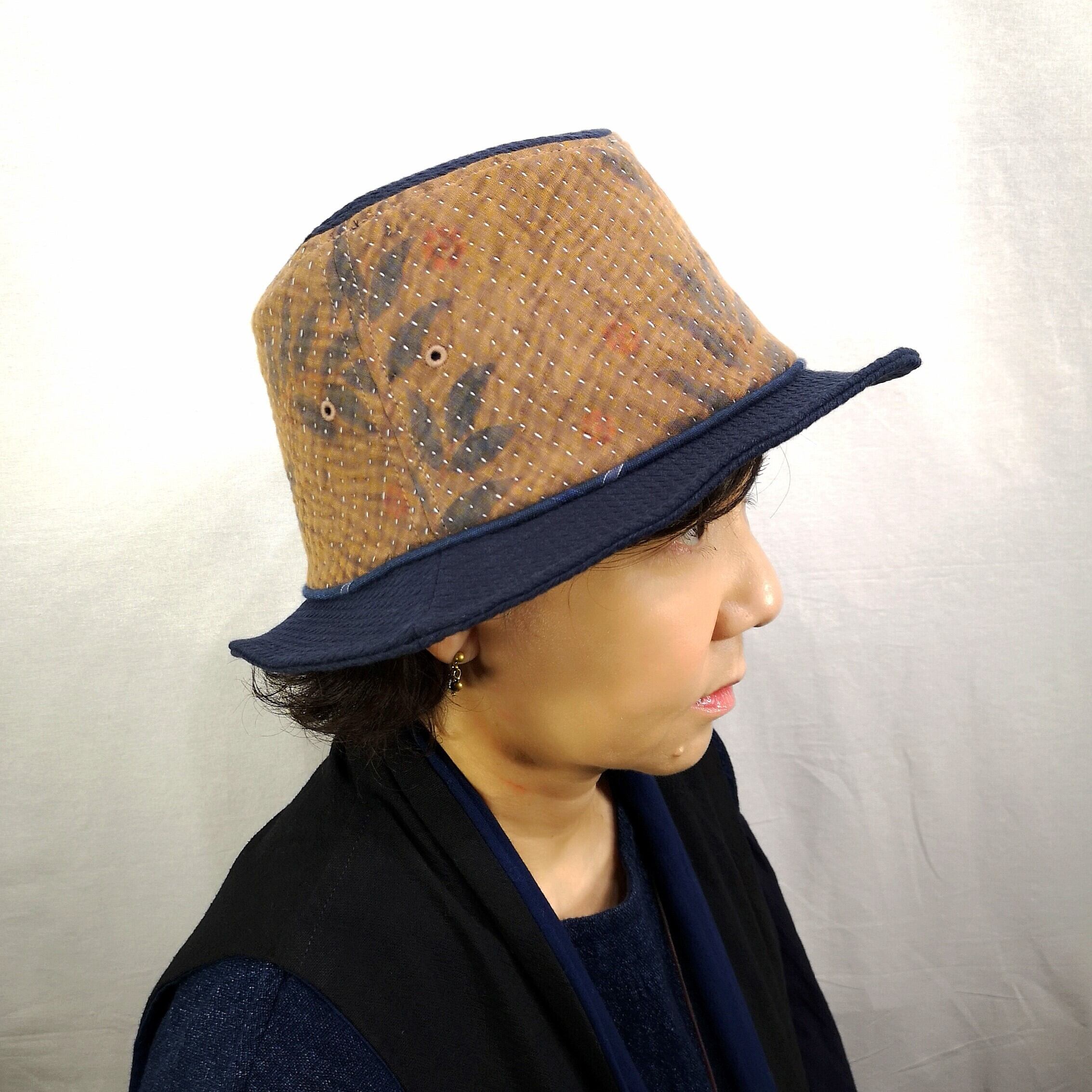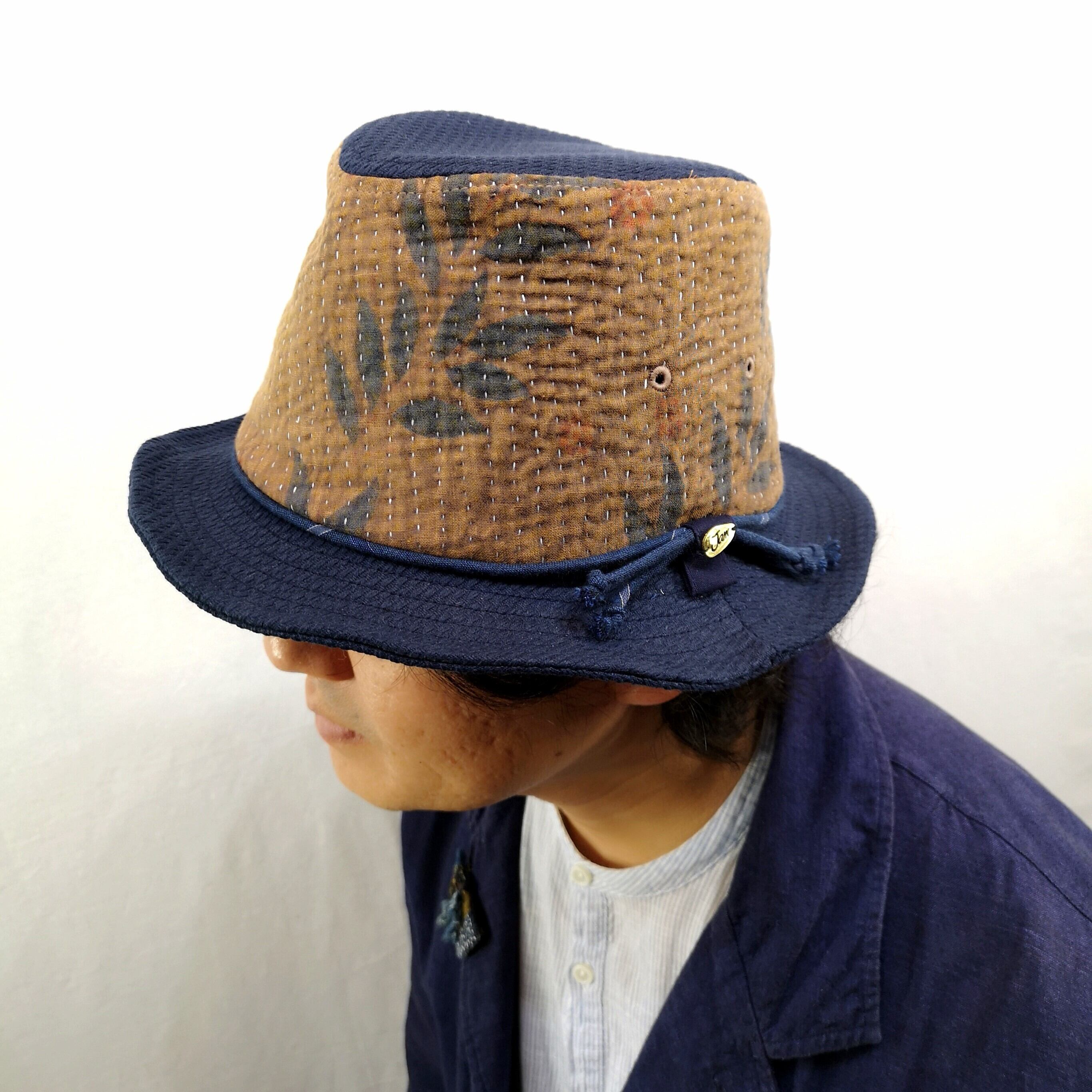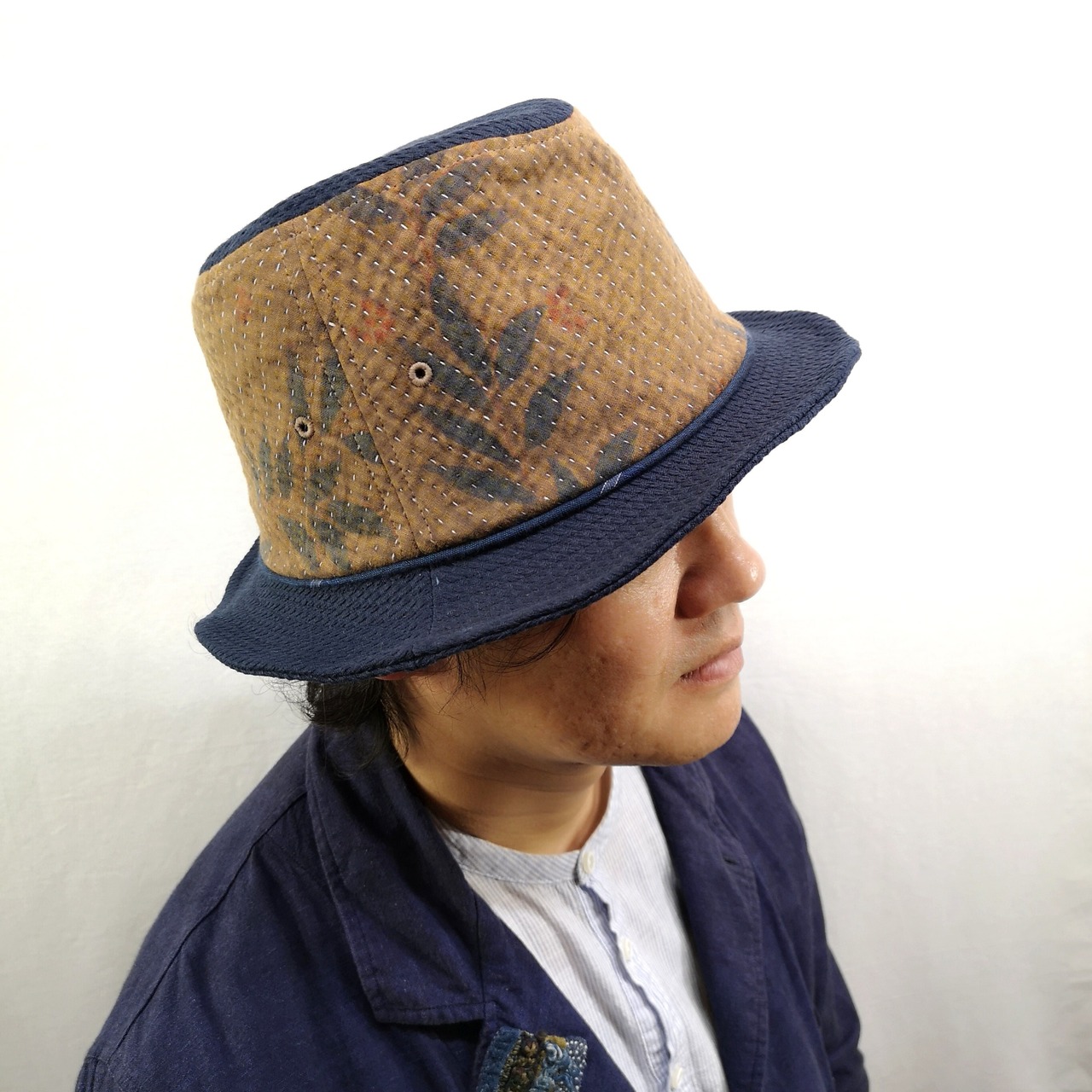 サイドクラウンにインドのラリーキルトを、トップクラウンとブリム(つば)に日本の剣道着で使われるコットンを組み合わせ作ったハット。