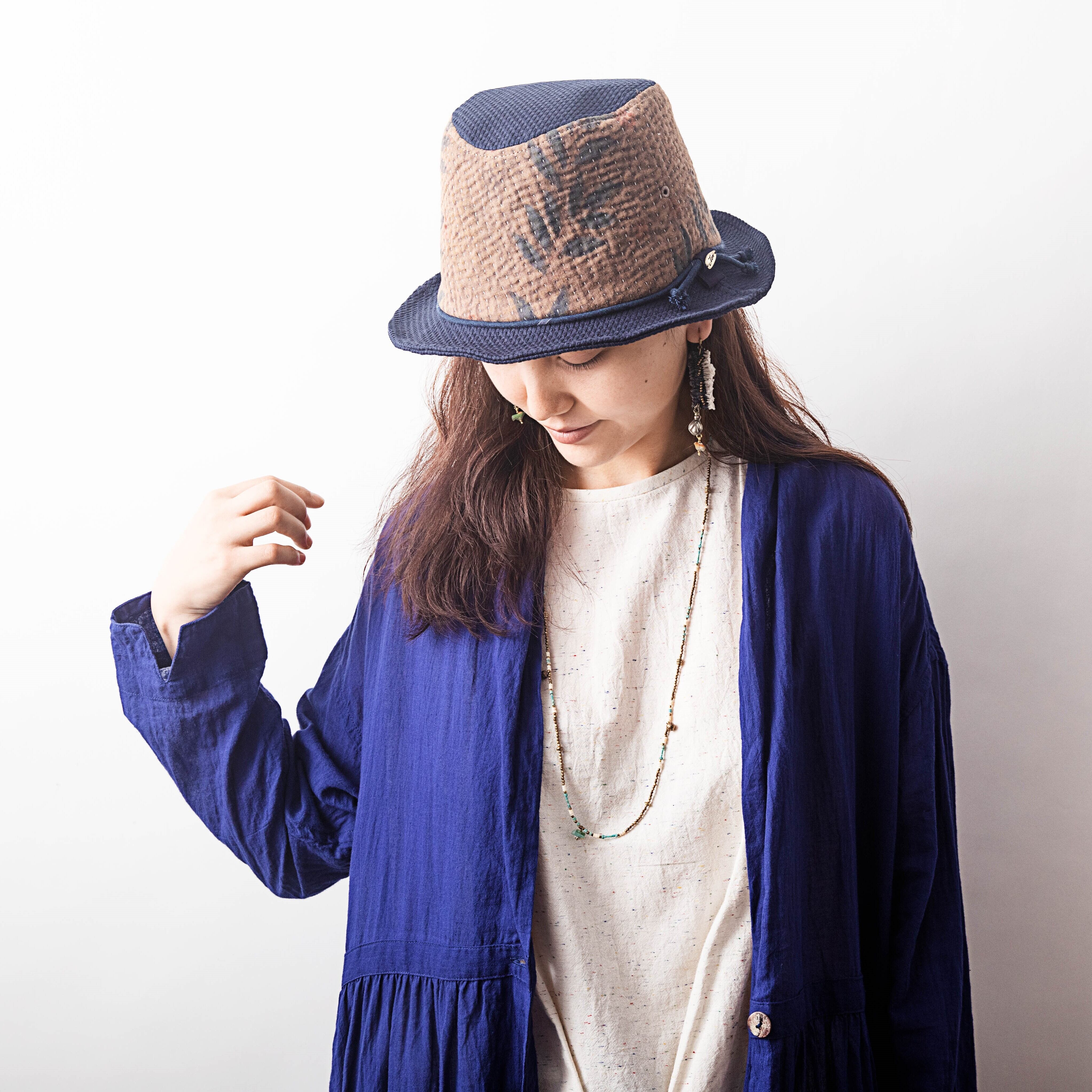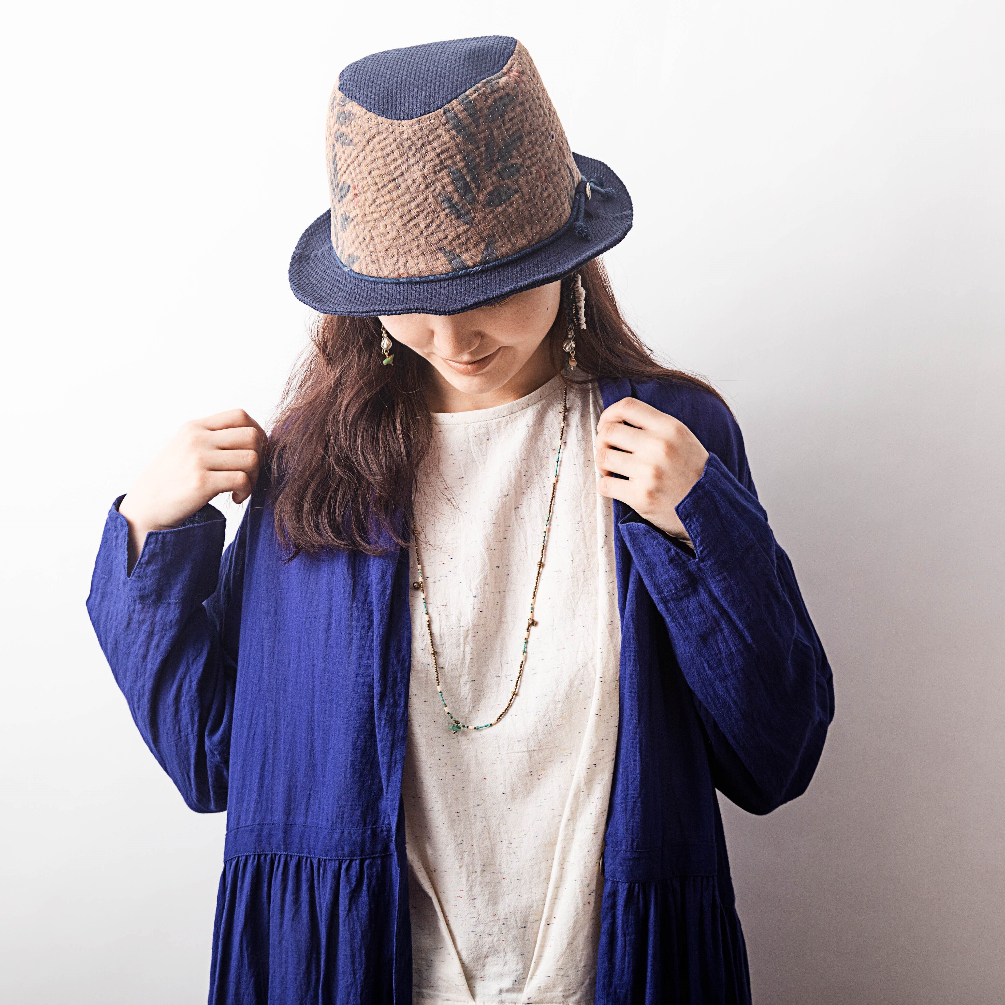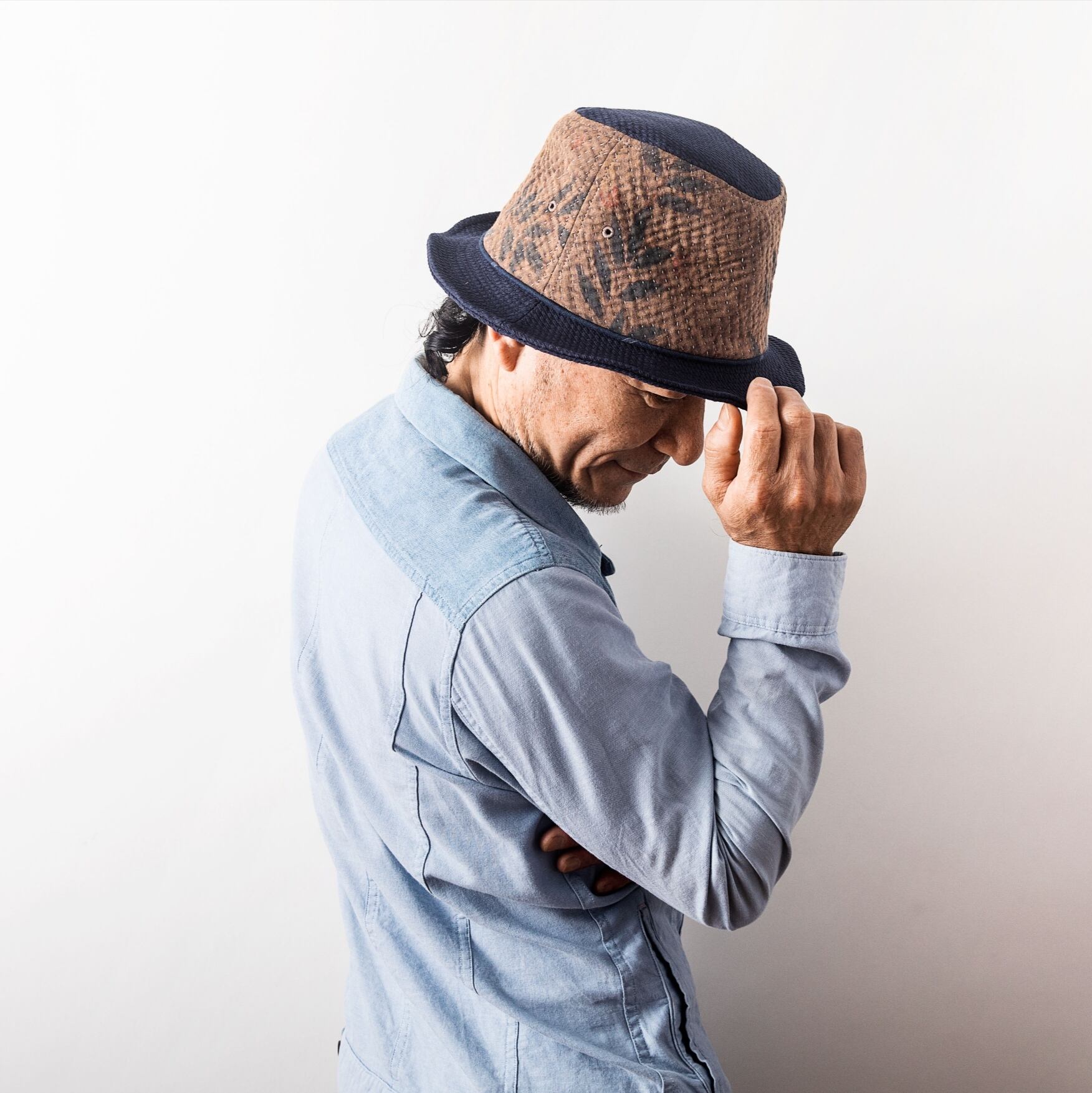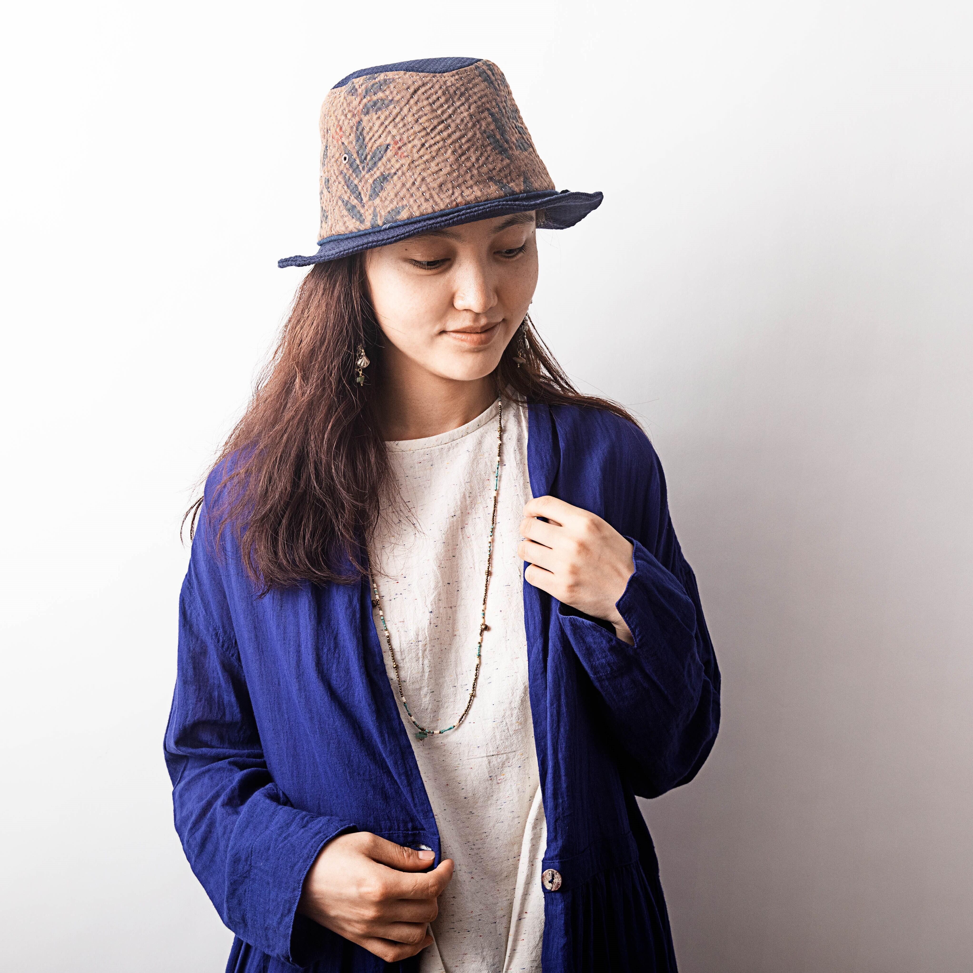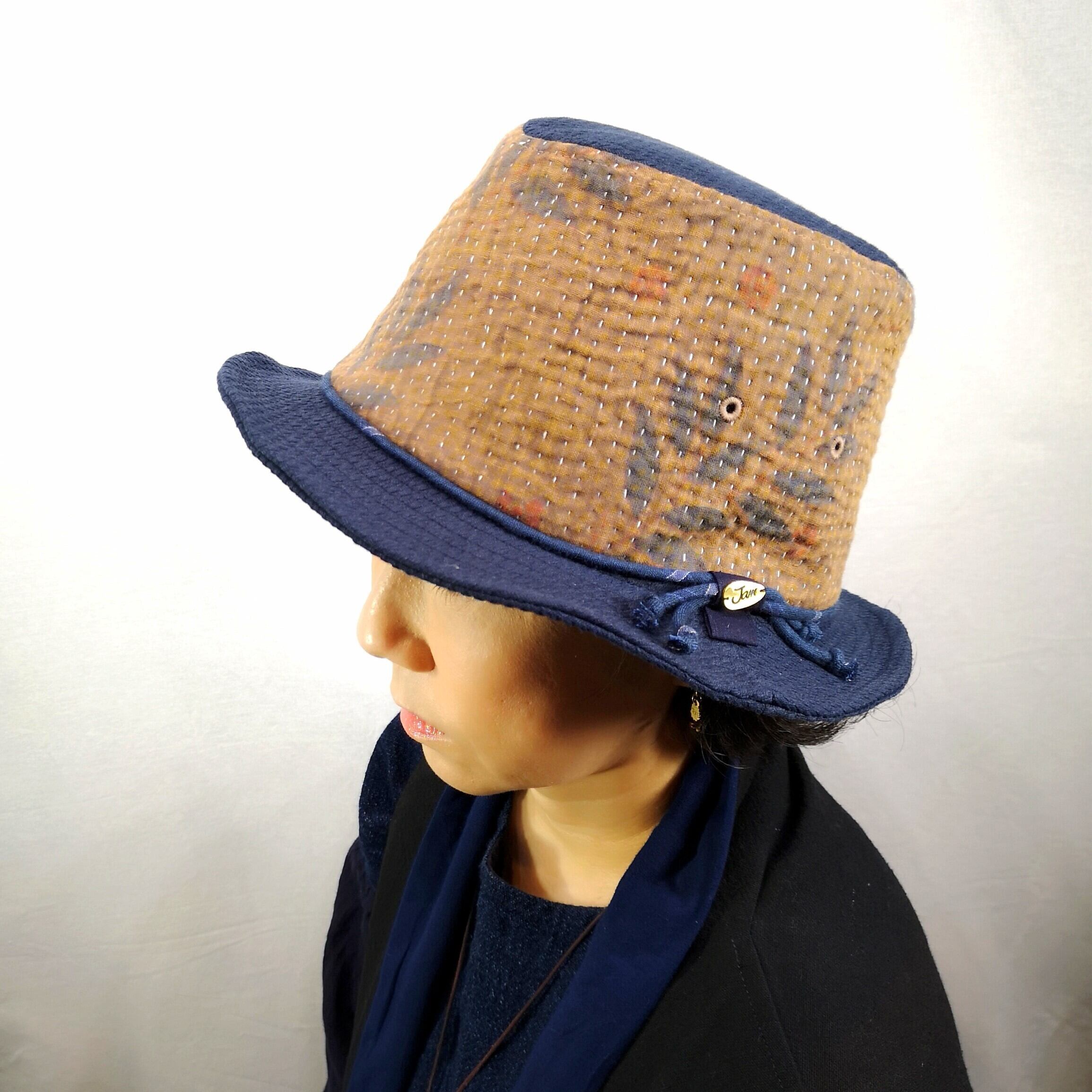 サイドクラウンにインドのラリーキルトを、トップクラウンとブリム(つば)に日本の剣道着で使われるコットンを組み合わせ作ったハット。