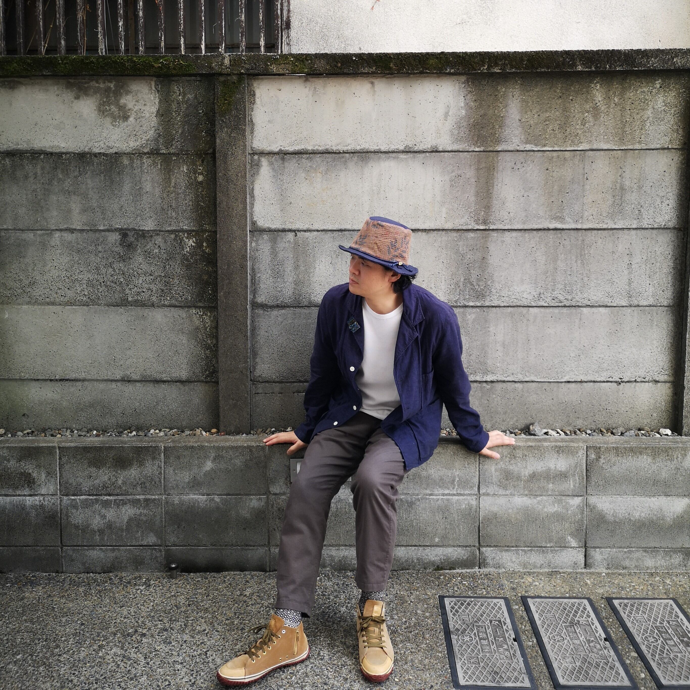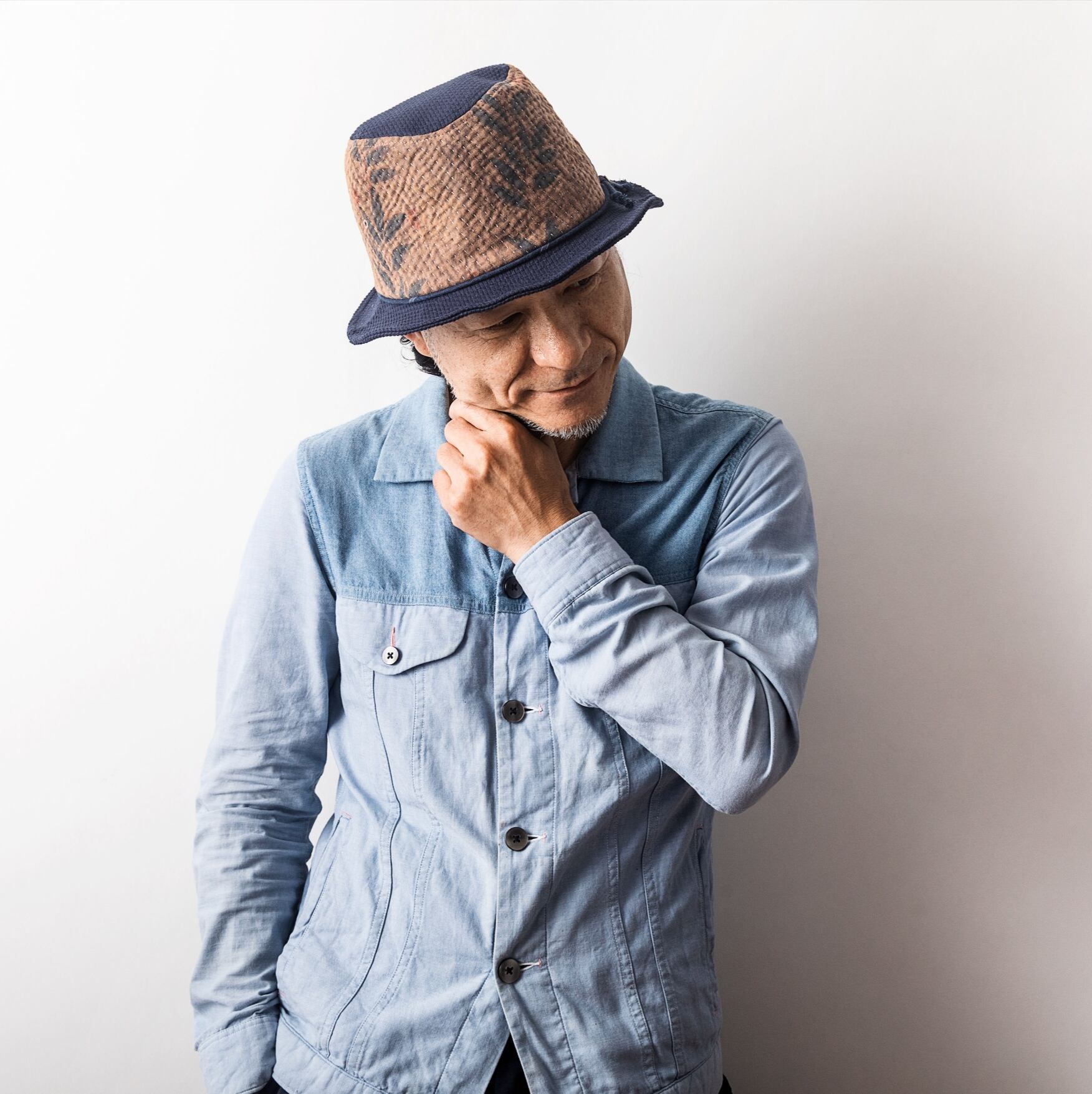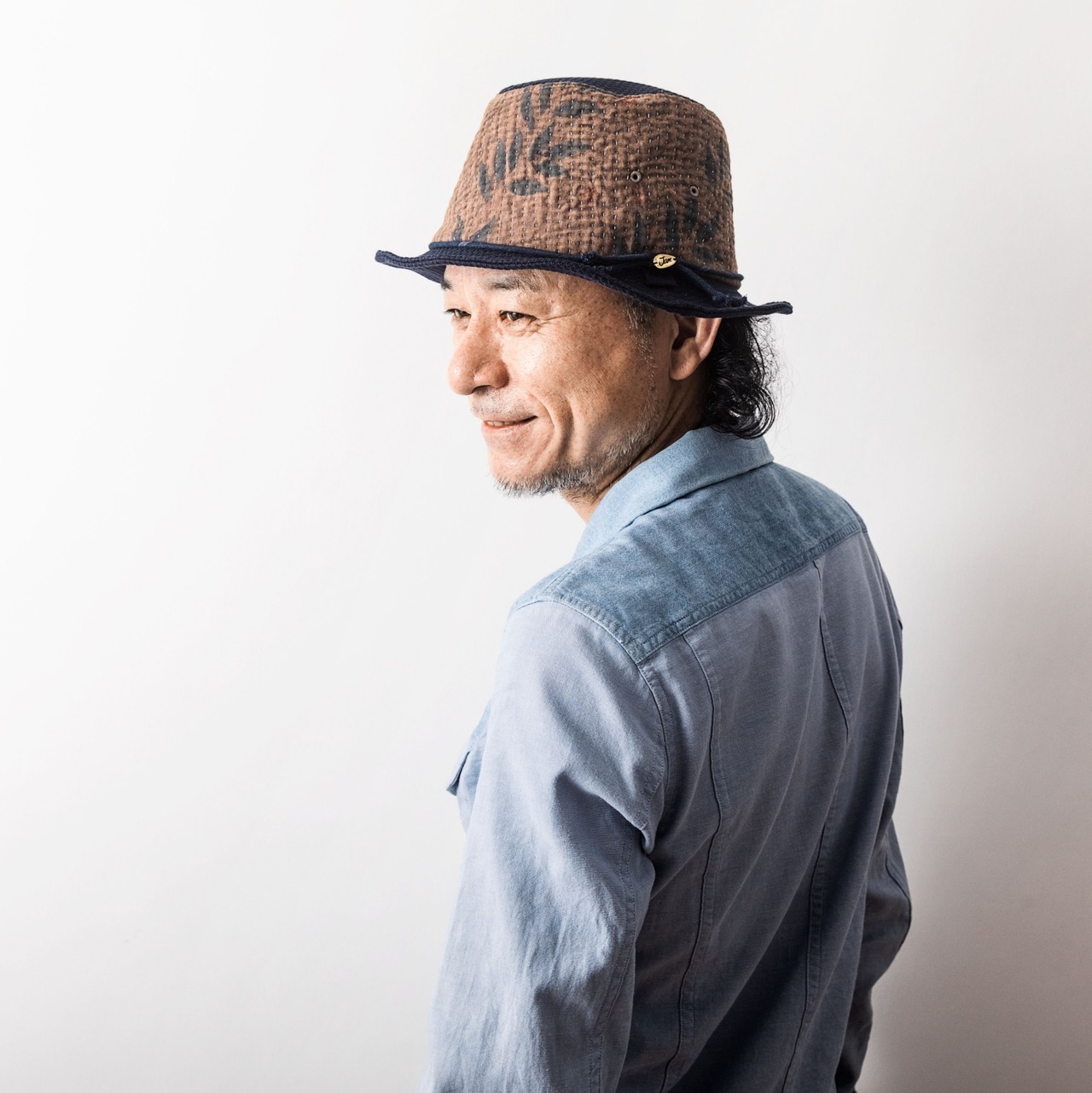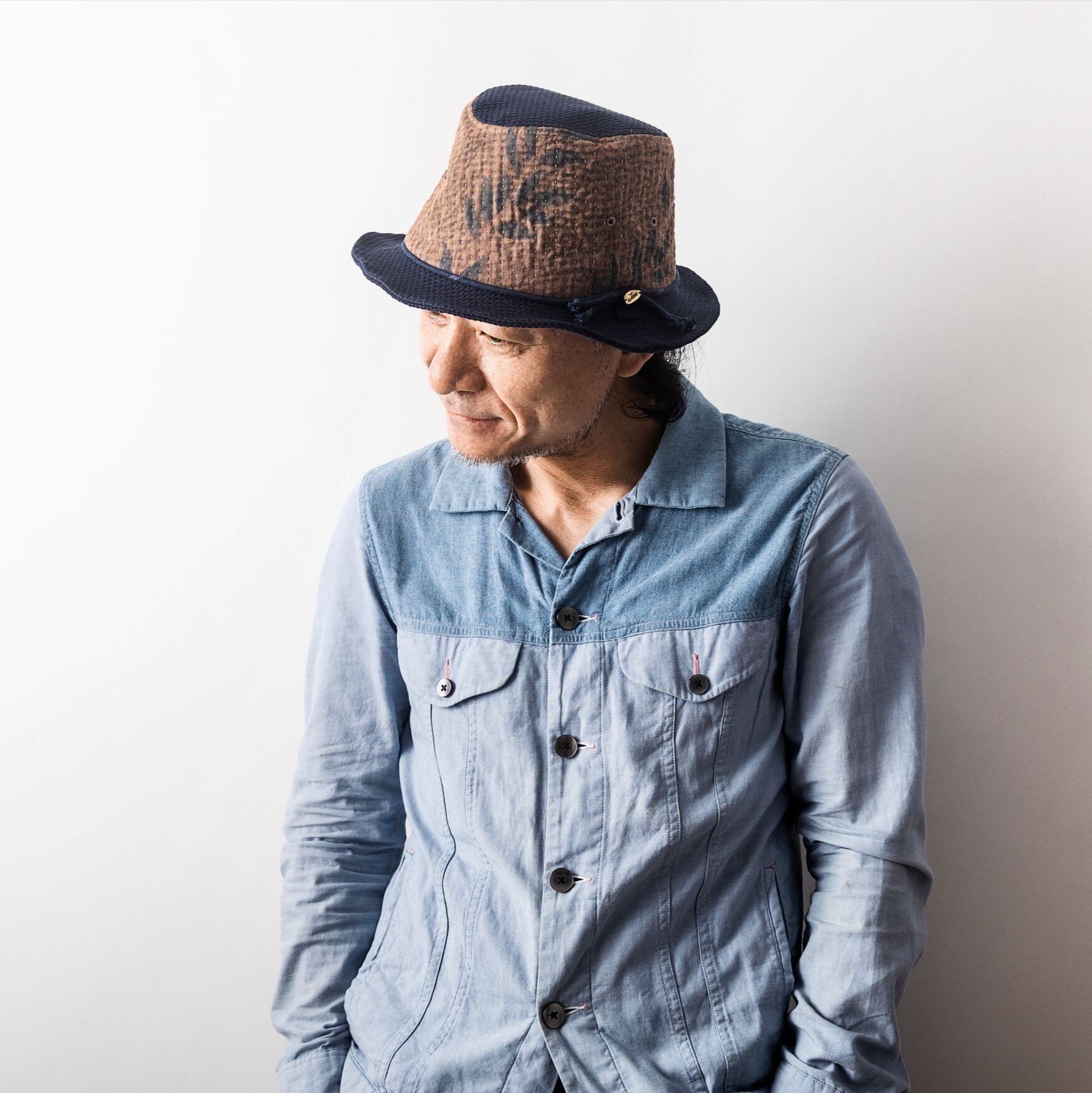 サイドクラウンにインドのラリーキルトを、トップクラウンとブリム(つば)に日本の剣道着で使われるコットンを組み合わせ作ったハット。