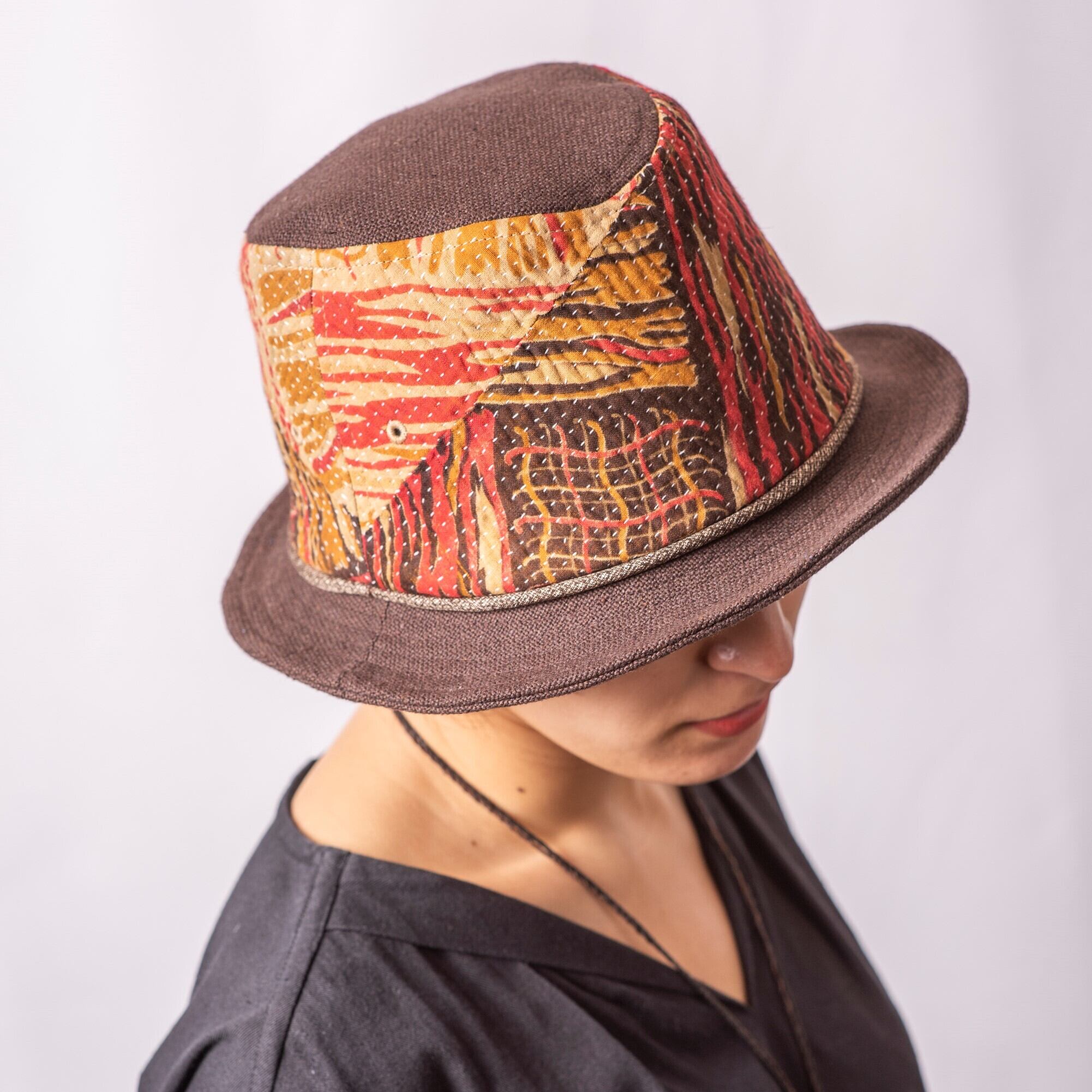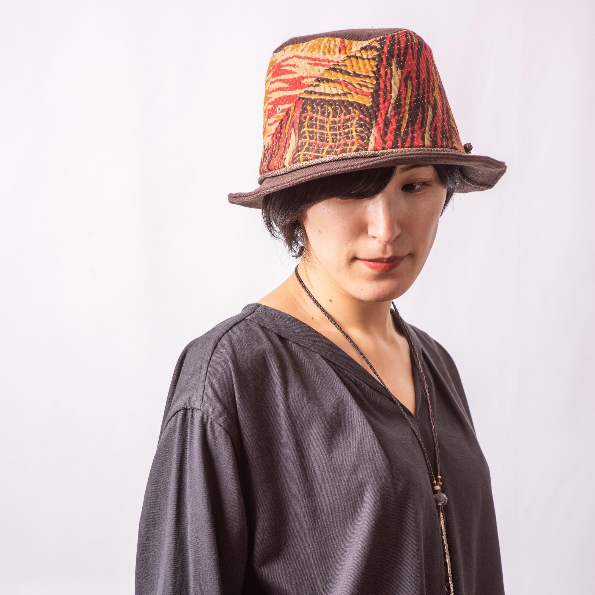 サイドクラウン部分にインドの伝統布ラリーキルト(※)を贅沢に使ったハット。