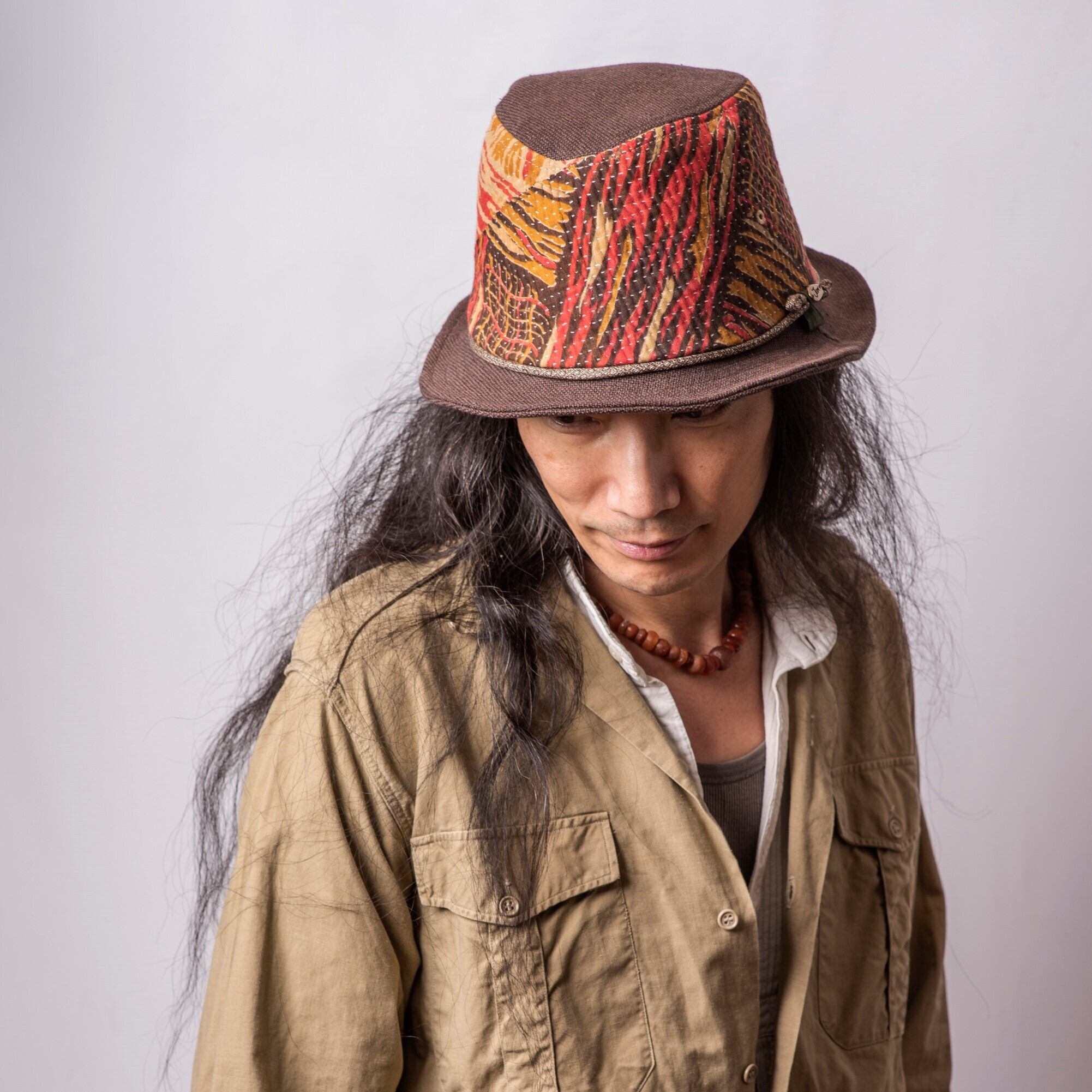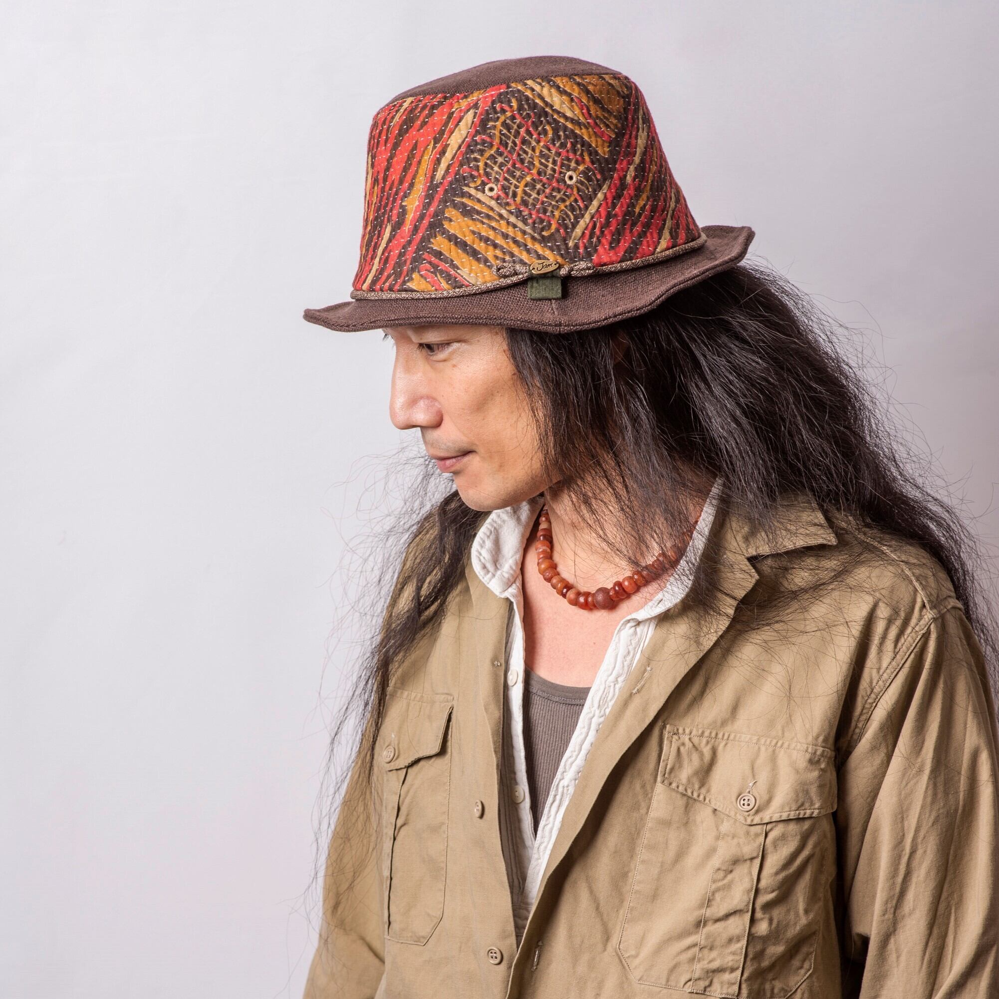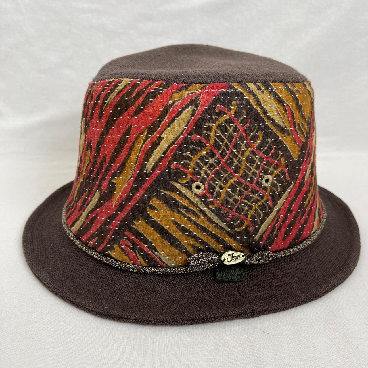 稲妻をイメージし、インドの伝統布ラリーキルトと大島紬で作ったハット『雷神』DarkBrown