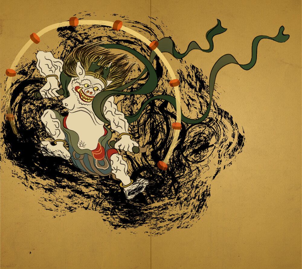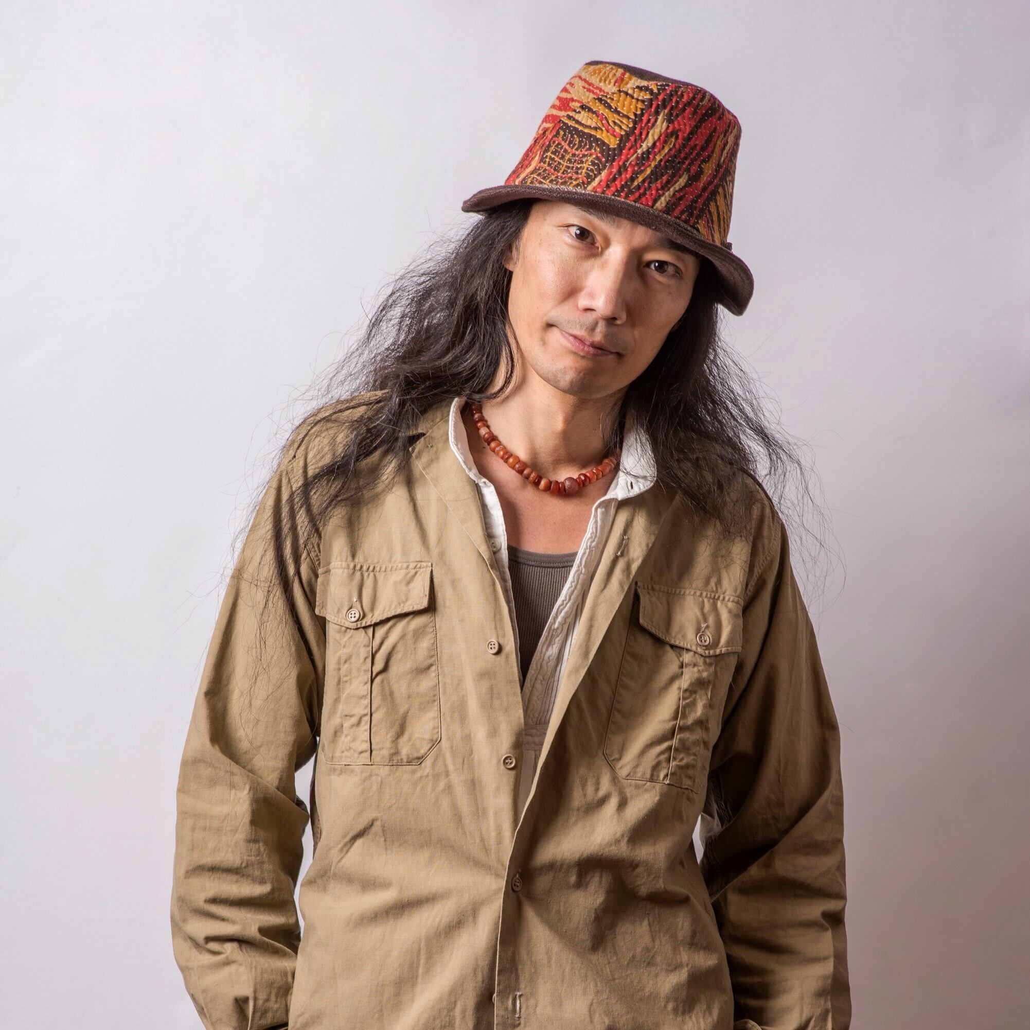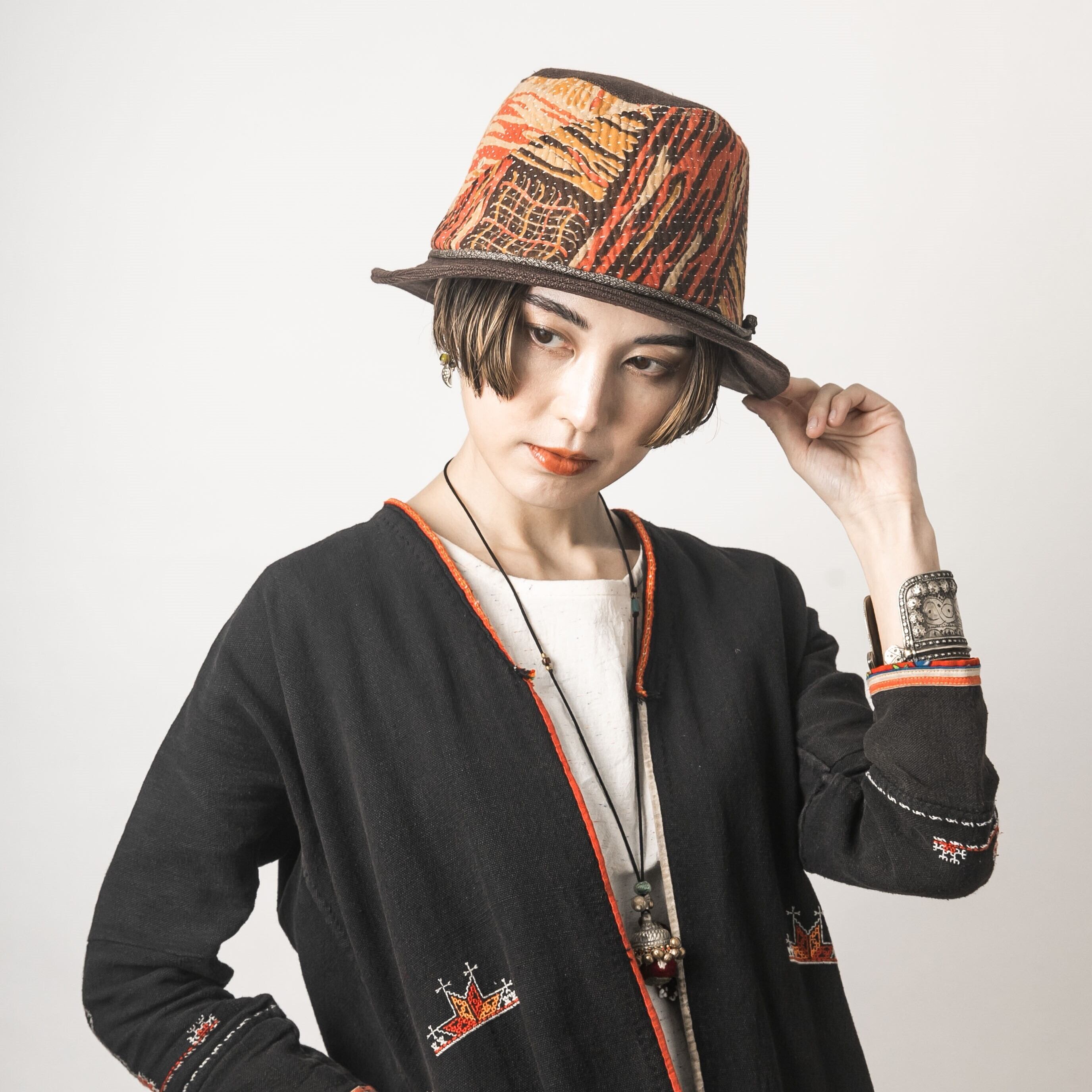 稲妻をイメージし、インドの伝統布ラリーキルトと大島紬で作ったハット『雷神』DarkBrown